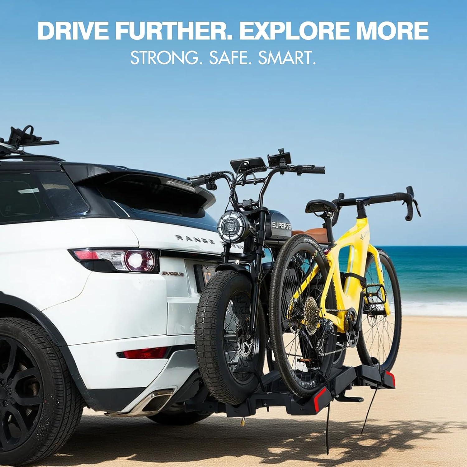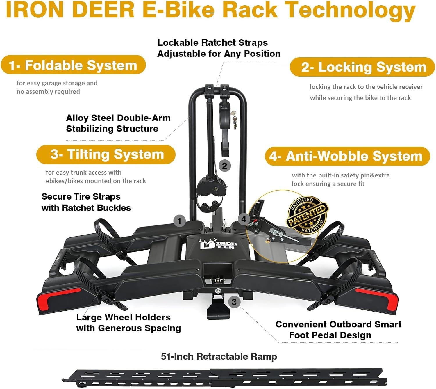 PATENTED WOBBLE-FREE&LOCKING&TILTING SYSTEM: The anti-wobble system with the patented self-locking hitch pin&extra lock ensures a secure fit in the hitch without rattling, enhancing driving stability and safety. The generous 11.5″ bike to bike spacing distance between the wheel holders reduces risk of ebike-to-ebike contact. Meanwhile, the balanced tilting feature allows for easy trunk access with an outboard smart foot pedal tilt when the ebike mounted on the electric bike platform.