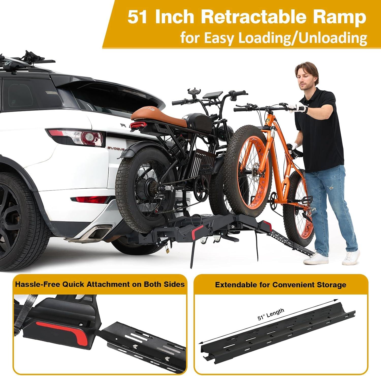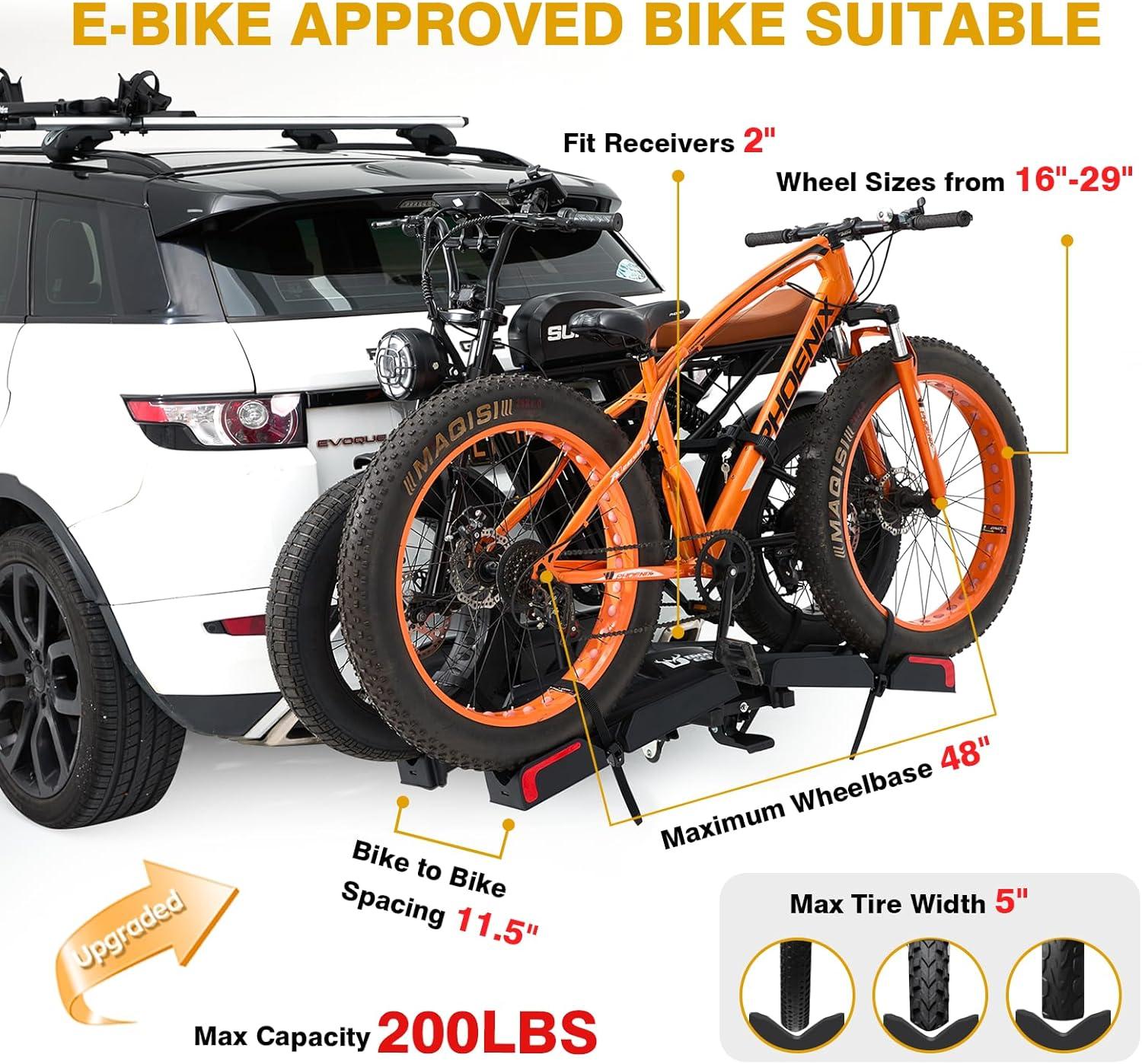 HEAVY-DUTY 200 LBS CAPACITY WITH RETRACTABLE RAMP: The hitch bike rack for car, including an extended bike ramp for easy loading/unloading and engineered with a sleek and modern design, is specifically to haul electric bikes with an upgraded capacity of 200 lbs (100 lbs/each). The ebike hitch rack accommodates both e-bikes and standard bikes with wheel sizes from 16″ to 29″, wheelbase lengths up to 48″ and tire widths up to 5″, making it ideal for carbon, mountain, downhill or fat tire ebikes.