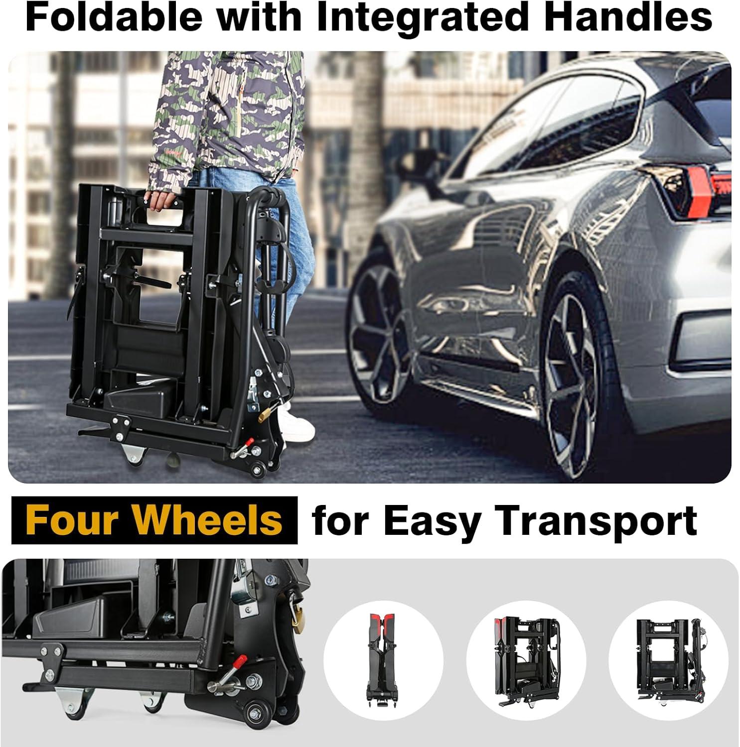 FOLDABLE DESIGN WITH 4 WHEELS: The Eco Pro Hitch 2 E-bike rack is ready to use straight out of the box, featuring a fully foldable design for easy garage storage and no assembly required. Its integrated carrying handles and convenient wheels help maneuver the ebike rack like a cart, ensuring effortless mobility when off the vehicle.