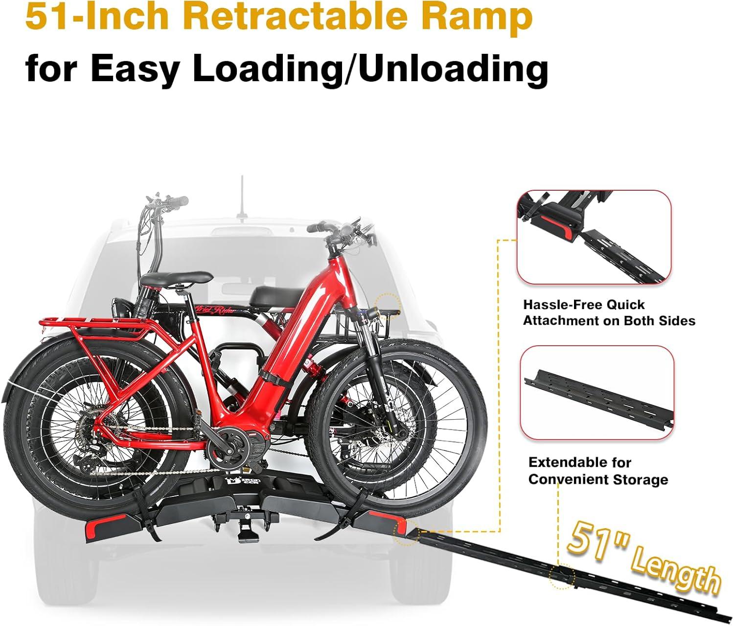 UPGRADED 200 LBS CAPACITY WITH RETRACTABLE RAMP: The hitch bike rack for car, including an extended bike ramp for easy loading/unloading and engineered with a sleek and modern design, is specifically to haul heavy duty electric bikes with an impressive capacity of 200 lbs (100 lbs/each). The ebike hitch rack accommodates both e-bikes and standard bikes with wheel sizes from 16″ to 29″, wheelbase lengths up to 48″ and tire widths up to 5″, making it ideal for carbon, mountain, downhill or fat tire ebikes.