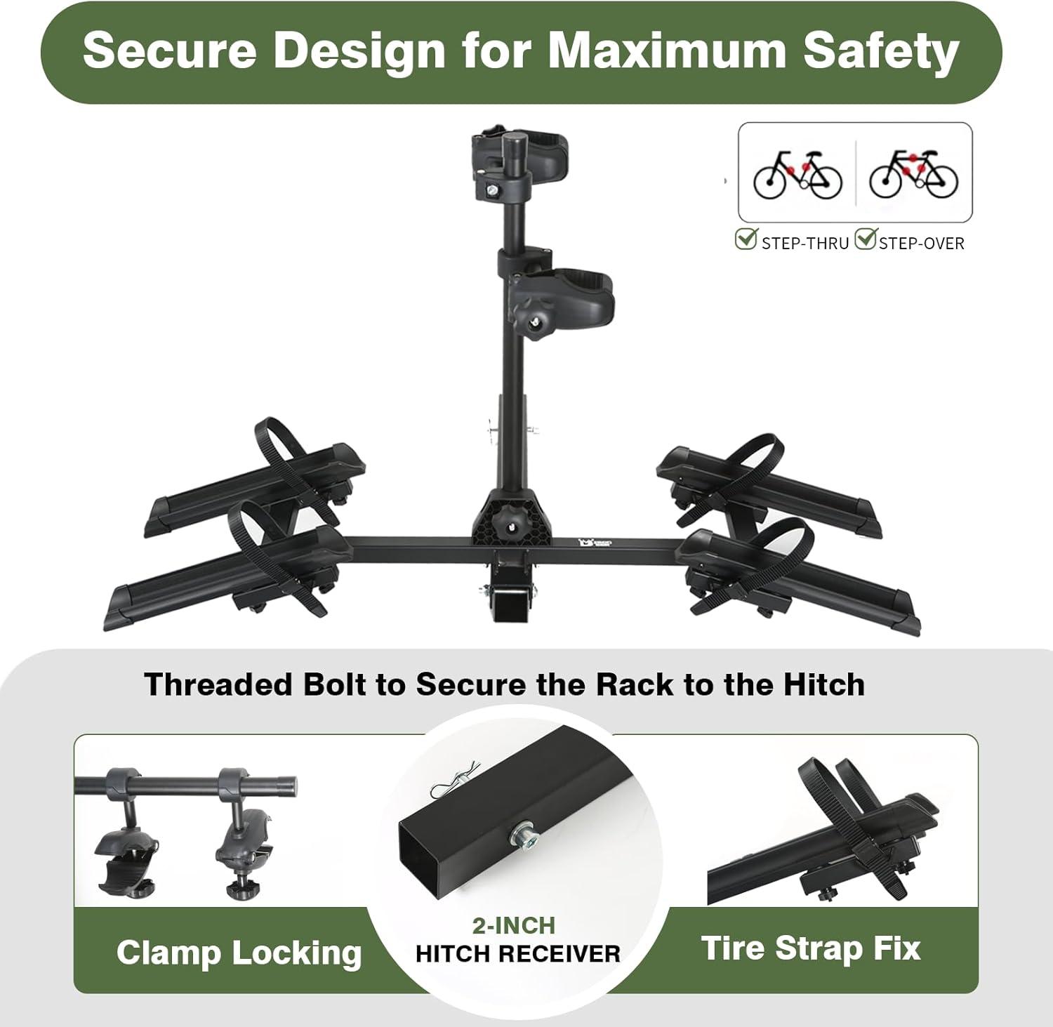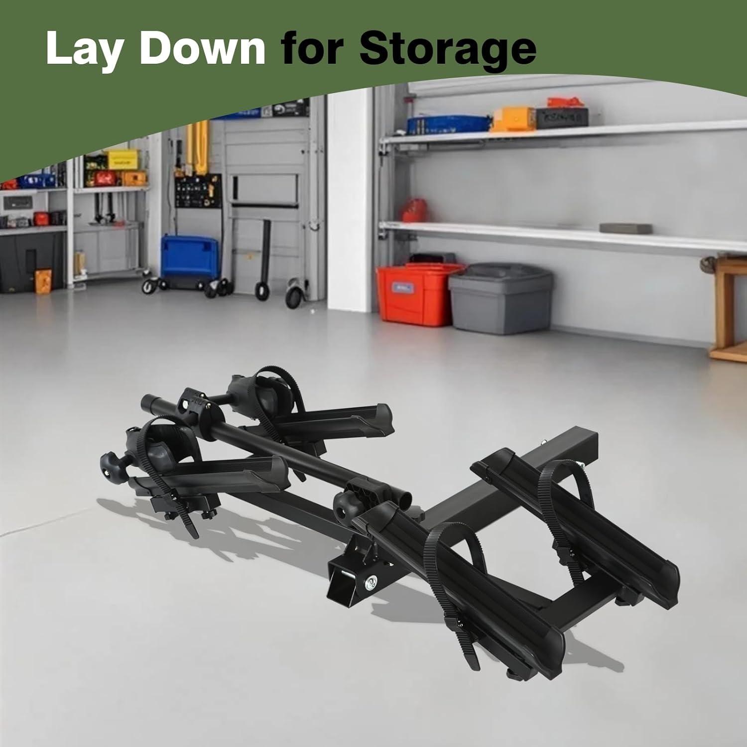 ANTI-WOBBLE&LOCKING&TILTING SYSTEM: The wobble-free system ensures a secure fit in the hitch without rattling, enhancing driving stability and safety. The generous spacing distance between the bike wheel holders reduces risk of bike-to-bike contact. Meanwhile, it is possible to rotate the button to lower the support arm of the rack and open the trunk when not in use.